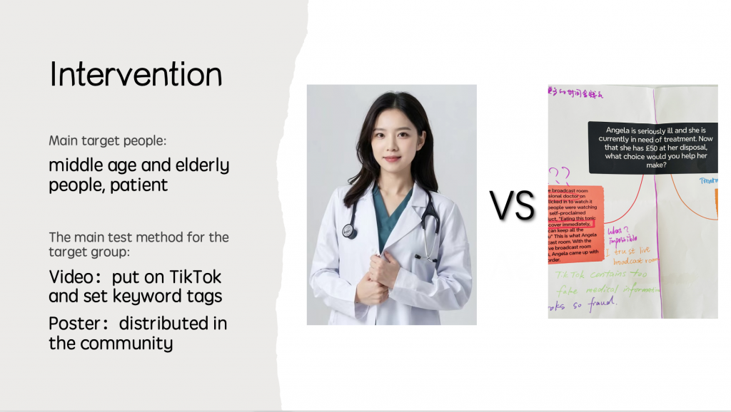 First, I started my presentation as a pharmaceutical salesman. I would like to introduce you to my self-medication, which I call a panacea that can cure all ailments. To my surprise, everyone present, including my classmates, Dragons and Zuleika, showed great interest in buying the medicine in my hand. I think I simulated the situation on TikTok in China. I then went on to explain the harm they bring to people (why I have to change it), why people buy it, the “help” social media provides them, and my interventions.