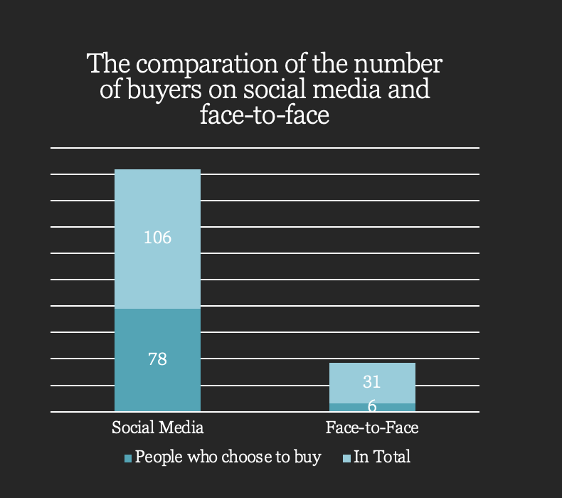 I received 106 responses, of which 78 people chose to buy, accounting for 73.6%. I sold to 31 people in face-to-face sales, and only 6 of them chose to buy, accounting for 19.3%. I send this comparison to my social media to tell people that people will unconsciously be brainwashed by special effects on social media, thus reducing people’s sanity when shopping, in this way I hope to urge everyone not to buy medicines on social media.