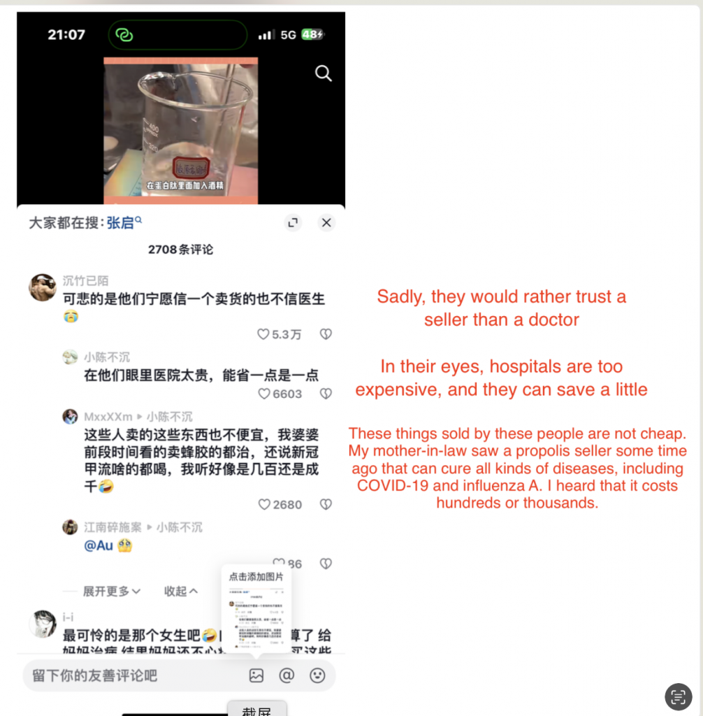 When sales are selling their pharmaceutical products on social media, they do some small experiements in order to convince people to buy them. For example: They add alcohol to their products and found that a large of colloids are produced, so they claim that their products are rich in precious ingredients such as fish glue.